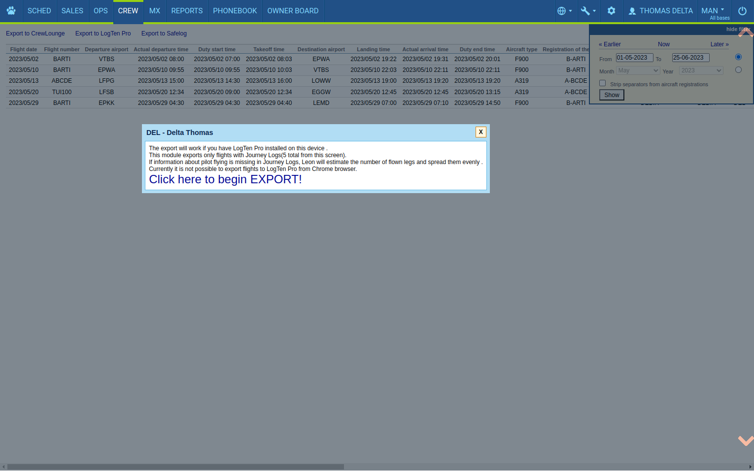 - export a list of all flights performed in selected period of time using ‘ My logbook export’