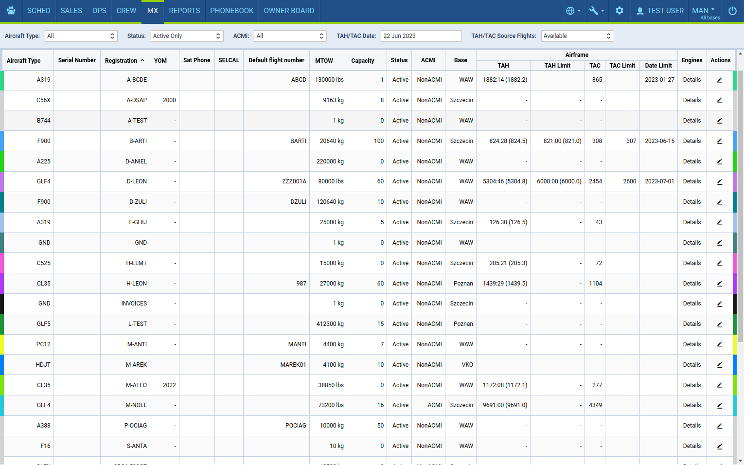 check general details of the fleet including Type, registration, TAH & TAC for airframe and engines