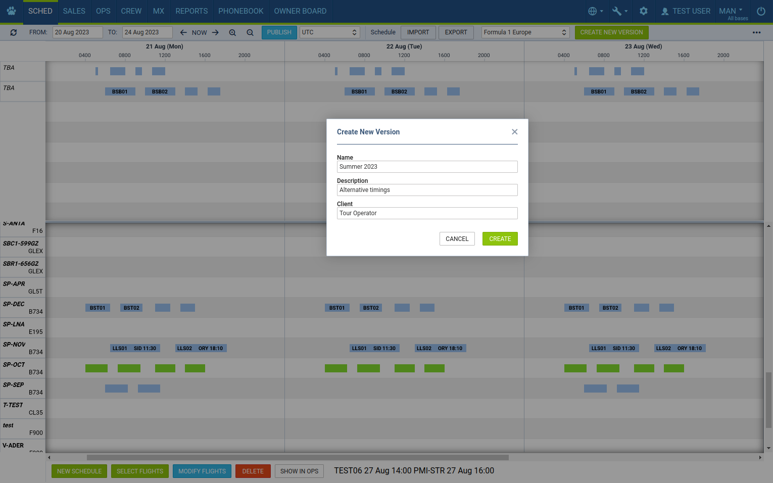 Create a schedule version where new schedules can be inserted either by uploading an SSIM or XLS file from a specific Client or by adding manually a new schedule without assigned aircraft.Select multiple versions of the schedule to preview in the SCHED overview.